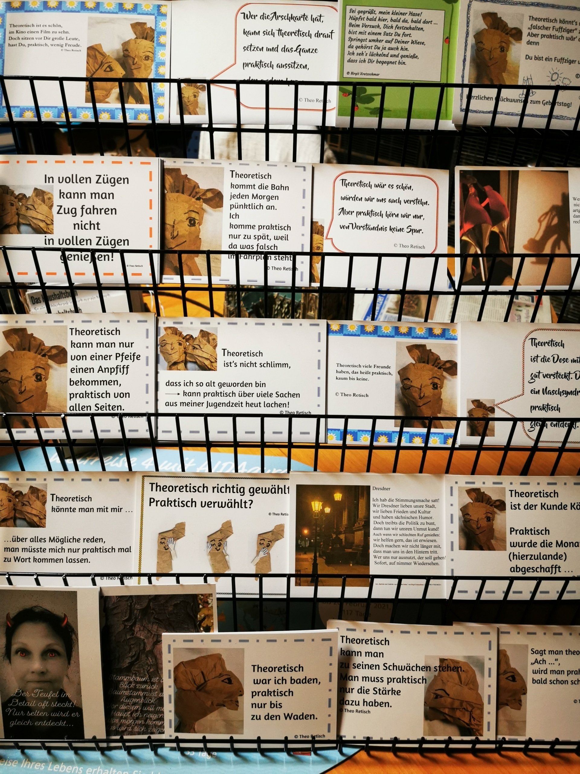 Einige seiner frechen, coolen, philosophischen Sprüche sind in 3 Sprüche-Büchern, auf Postkarten, Bierdeckeln, Kissen, Bandanas, Kleidungsstücken, Masken, Zaubertassen, Platzdeckchen, Geburtstagskalendern ... zu haben. Eine kleine Auswahl ist im Reisebüro vorrätig, mehr gibt es auch online im Theo-Retisch-Shop.