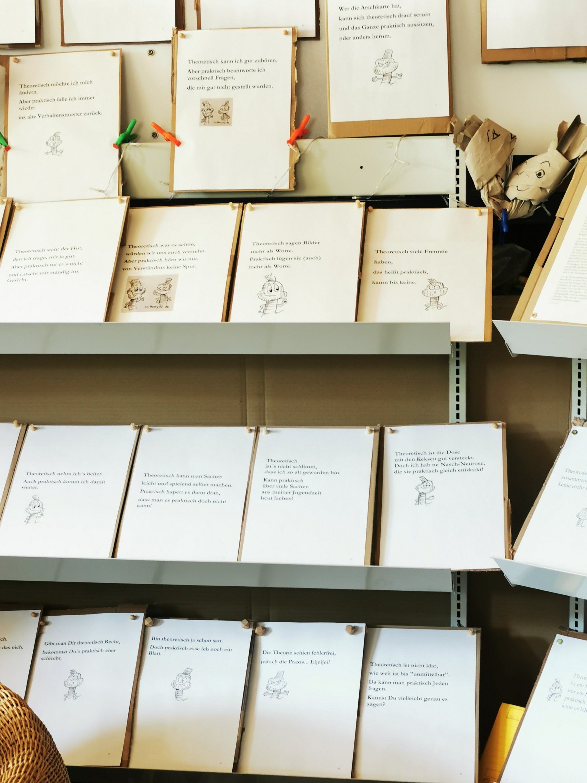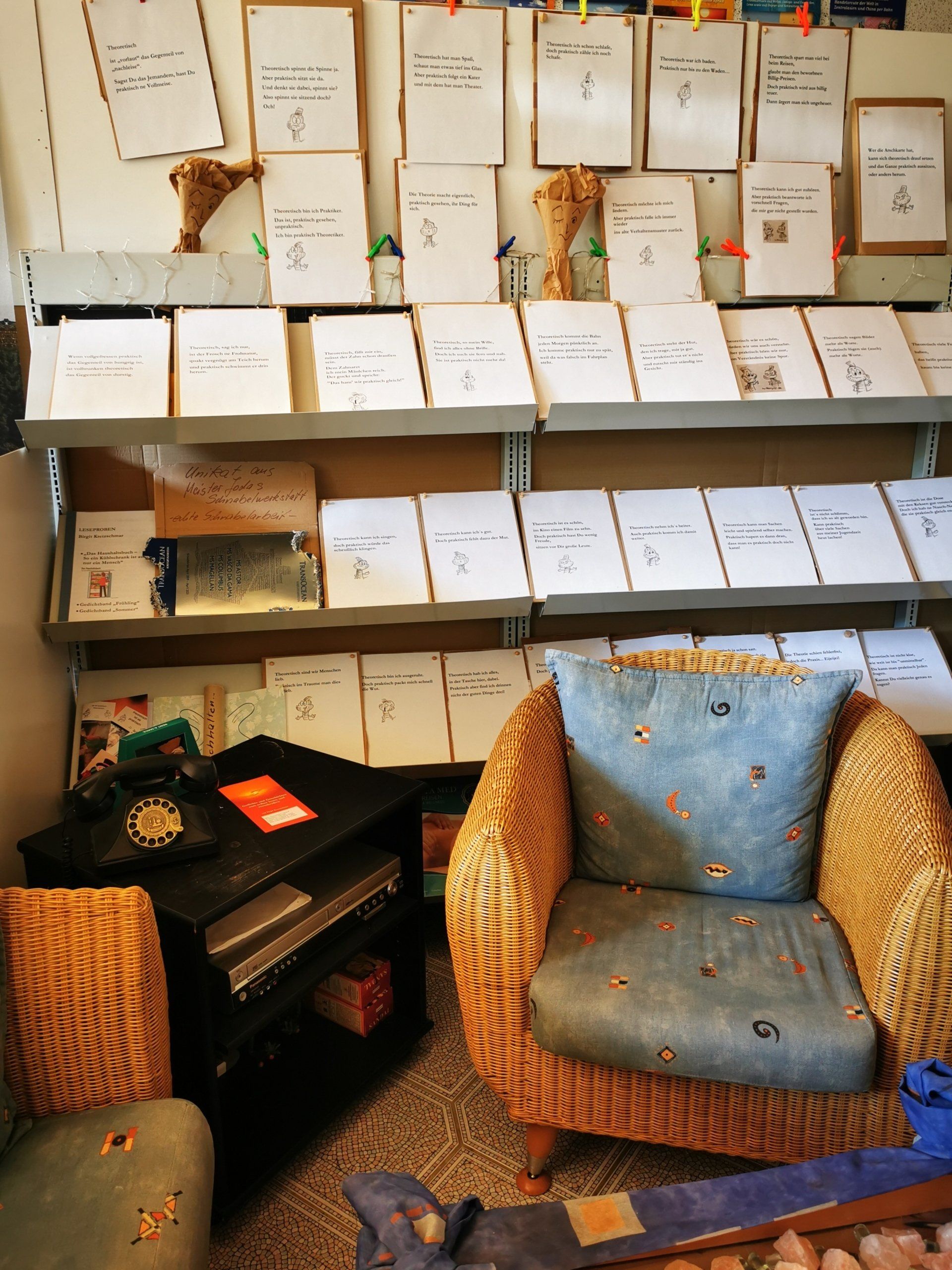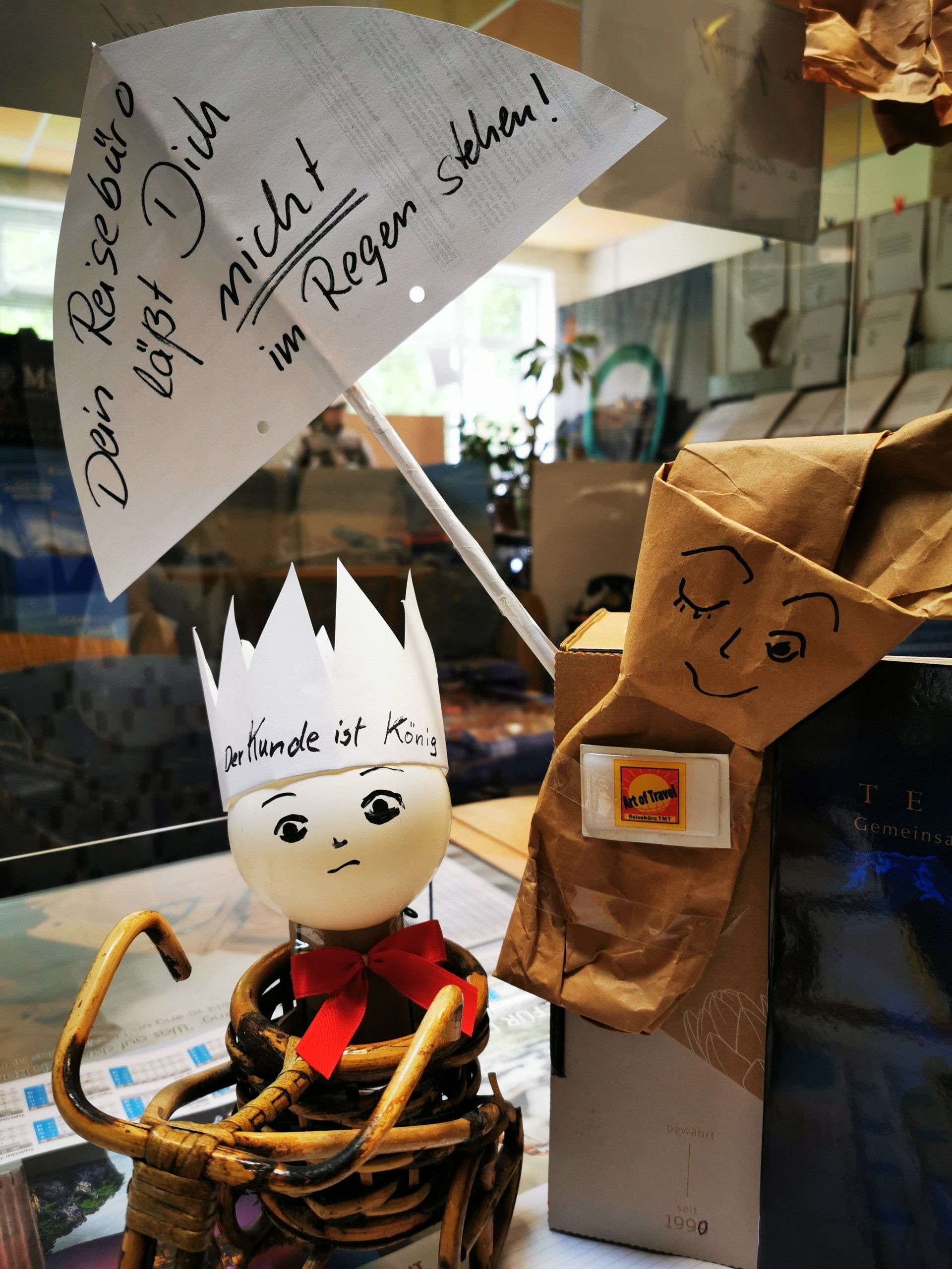 Seit Ausbruch der Corona-Pandemie gibt es in meinem Reisebüro kaum noch gedruckte Reisekataloge - die freien Katalogständer und Präsentationsflächen werden deshalb zur Ausstellung von Büchern und Kunstwerken aus meiner eigenen Kreativwerkstatt genutzt. Man kann unter anderem Theo Retisch kennenlernen, auch praktisch: Theo ist mein (vor-)witziges Knotenmännchen!